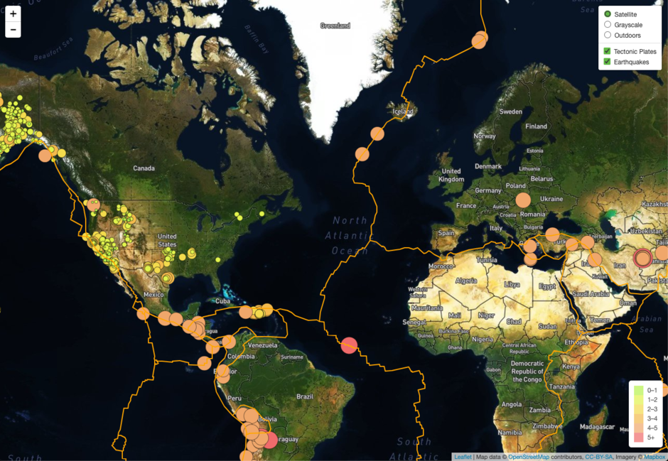 This is an interactive Earthquake and Tectonic Plates Visualization map the lets the user view where earthquakes have occured around the world. The data that was used to create this visual is from the USGS GeoJSON Feed and Github: tectonicplates.