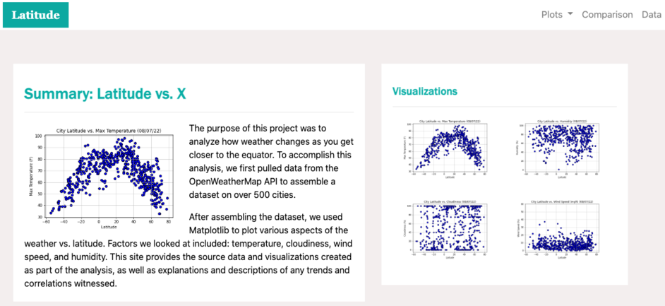 This is a Weather Data Visualization dashboard that will let the viewer see the data that was used to create the graphs. When the graphs are clicked in the Visualizations sections, it will take the viewer to that specific graph an give a summary. Similar to the scroll bar, due take a look at the comparison and data pages to see more!
