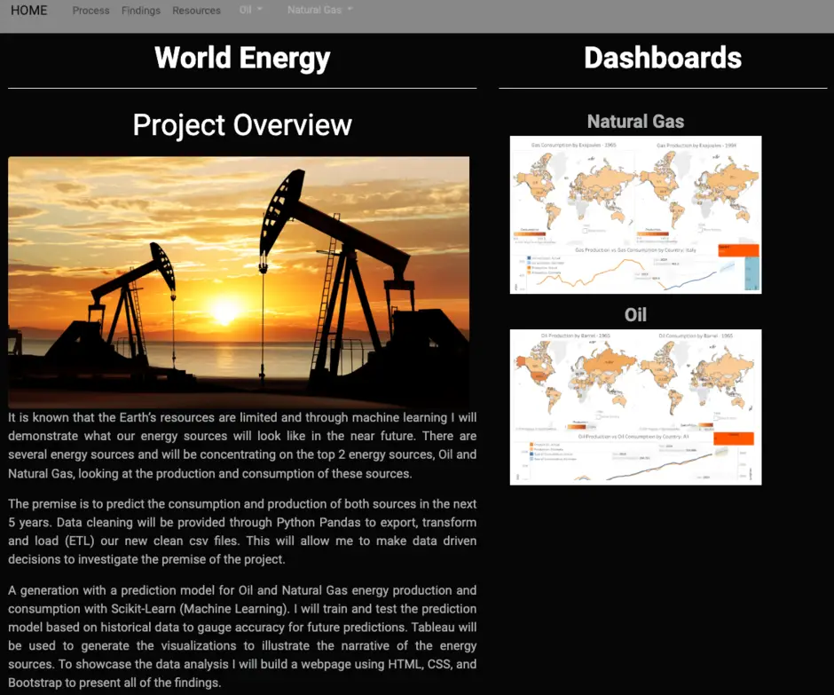 It is know that the Earth’s resources are limited. I will discover what energy sources would look like in the near future. Out of the different energy sources the focus will be the top 2 energy production and consumption sources: Oil and Gas. The premise is to predict the consumption and production of both sources in the next 5 years. Data cleaning will be done using Python Pandas to perform the ETL (Extract, Transform, and Load) process for the new cleaned csv files. This will allow me to make data driven decisions to investigate the premise of the project. Prediction models for oil and gas energy production and consumption with Scikit-Learn (Machine Learning). I will train and test the prediction model based on historical data to gauge accuracy for future predictions based on trends. Tableau will be used to generate the visualizations to illustrate the narrative of the energy sources (oil and gas). To showcase the data analysis I will build a webpage using HTML, CSS, and Bootstrap to present all of the findings.